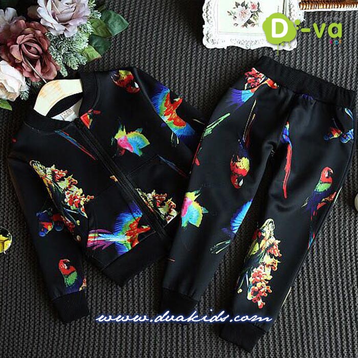 ชุดเสื้อแจ็คเกตแขนยาว+กางเกงขายาวสีดำ ลายนก