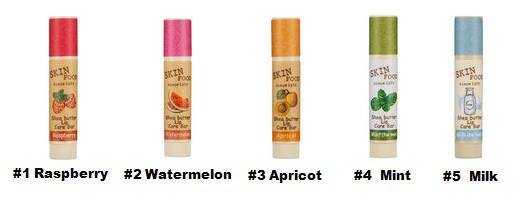 Skinfood Shea Butter Lip Care Bar 3.5g ลิปมันกลิ่นผลไม้ เพิ่มความชุ่มชื้น ปากนุ่มด้วยคุณค่าวิตามิน #1 Raspberry #2 Watermelon #3 Apricot #4 Mint (for men) #5 Milk (for baby)