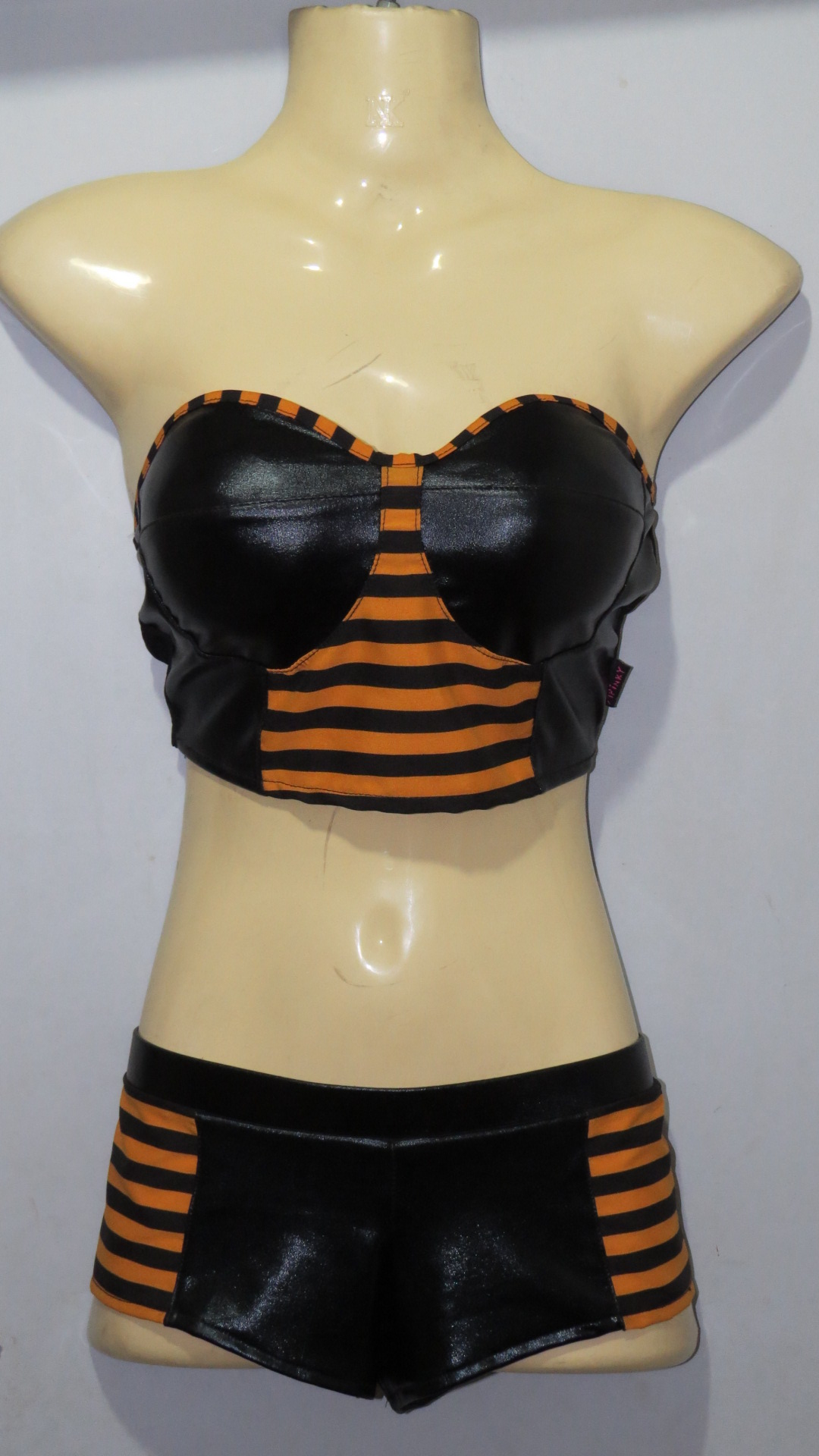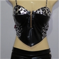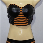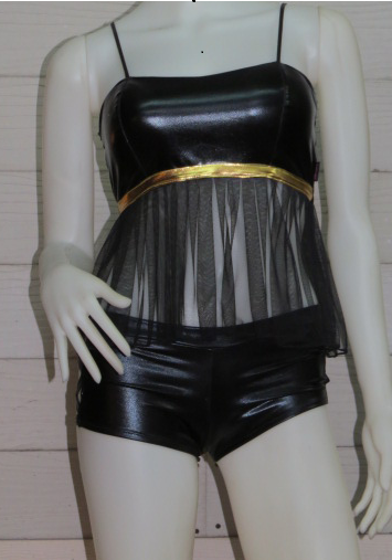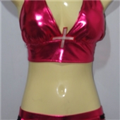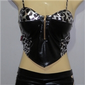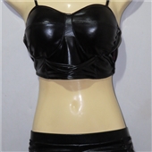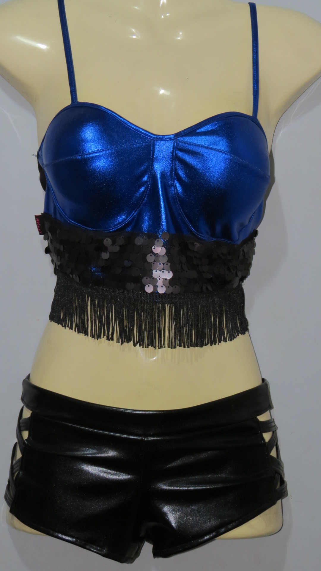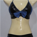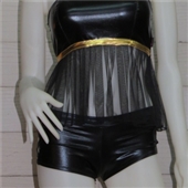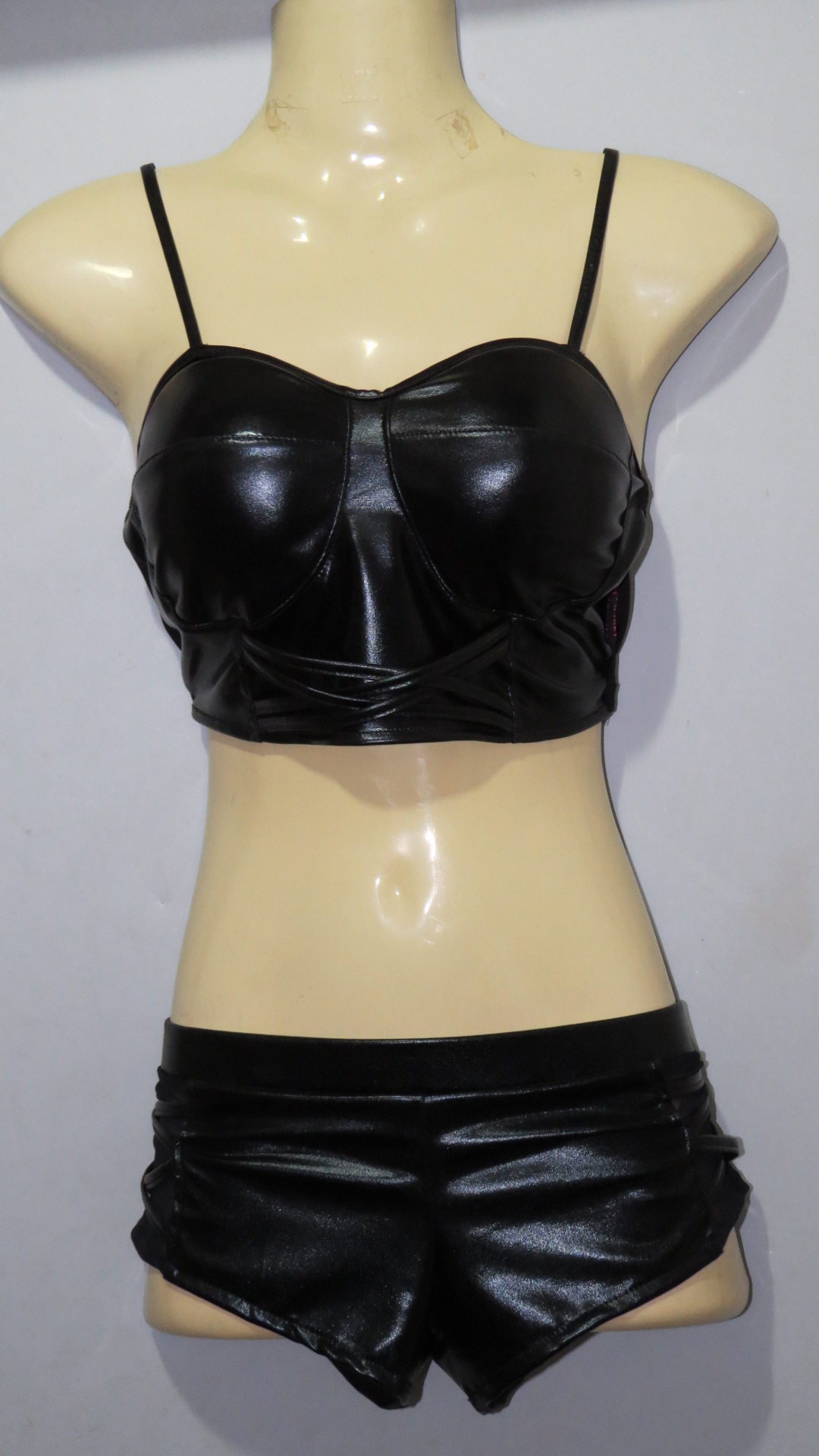 ชดโคโยตี้ ตัวเสื้อเป็นสายผูกคอ  และสายผูกด้านหลัง   ตกแต่งด้วยผ้ายีนส์สีน้ำเงินตัดกับหนังสีดำยืดหยุ่นได้มีโบว์ด้านหน้าเพิ่มความน่ารัก  คู่กางเกงหนังสีดำ ชุดนี้น่ารักมากค่ะ
