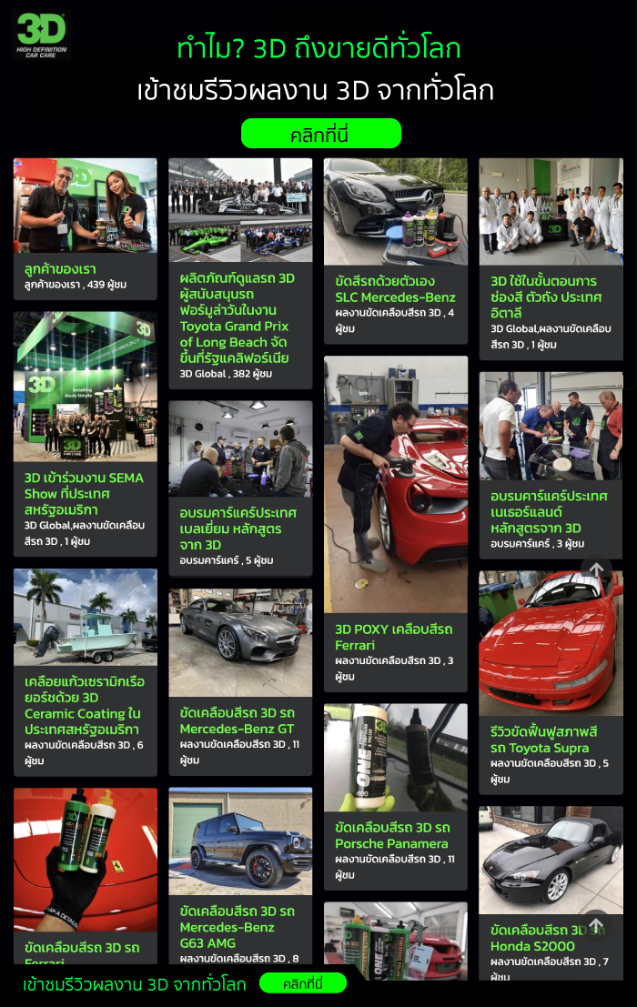 - สามารถเข้าชมผลงานคาร์ดีเทลลิ่งจากทั่วโลกที่ใช้ผลิตภัณฑ์ 3D Car Care ได้ที่ คลิ๊ก >> www.3dthailand.com