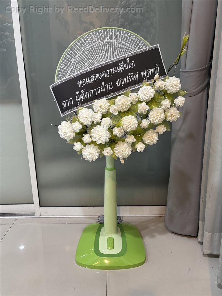 พวงหรีดพัดลมสไลด์ฮาตาริ/ชาร์ป 16 นิ้ว ประดับด้วยดอกไม้ประดิษฐ์สีเขียว-ขาวมุมขวาล่างใหญ่เป็นพิเศษ