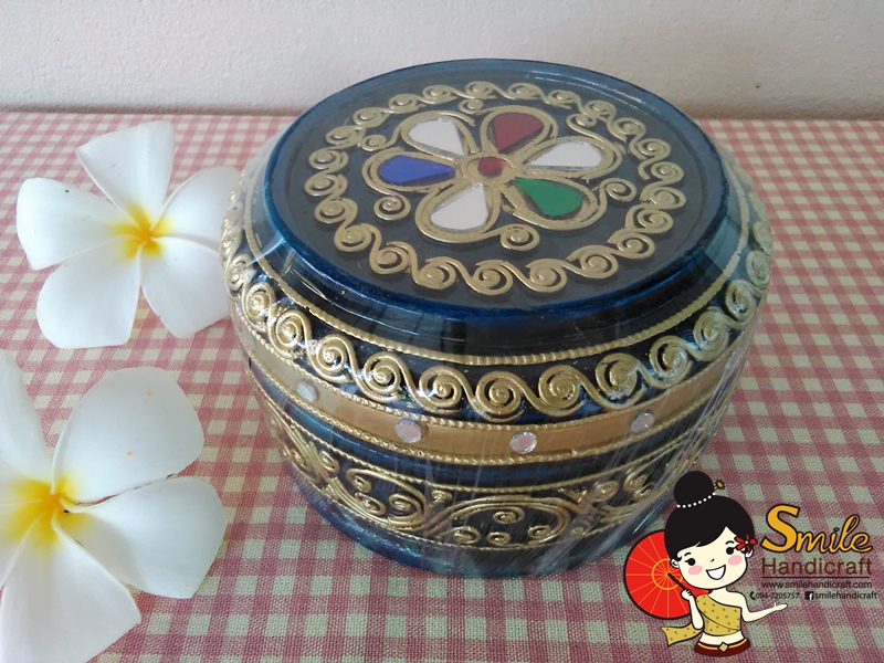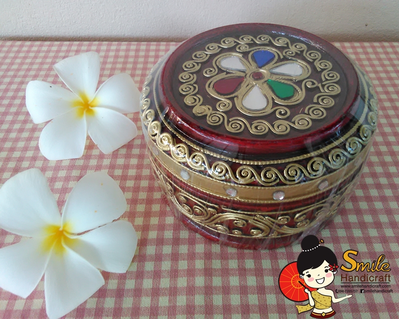 ตลับไม้กลม ขนาด 5 นิ้ว งานแต่งลายเส้นและเขียนทอง เป็นสินค้า Handmade เหมาะสำหรับเป็นของฝาก ของที่ระลึก หรือของชำร่วยในงานพิธีต่างๆ มี 3 สี คือ สีแดง สีเขียว สีน้ำเงิน