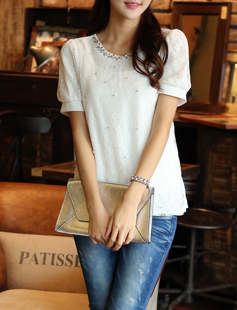 เสื้อแฟชั่นชุดทำงานผ้าลูกไม้แขนสั้น ประดับมุก ตัวนี้แบบน่ารักมาก ๆ เหมาะสำหรับสาวๆบุคลิกหวานๆ เรียบร้อยดูดีมี 4 size S , M , L , XL