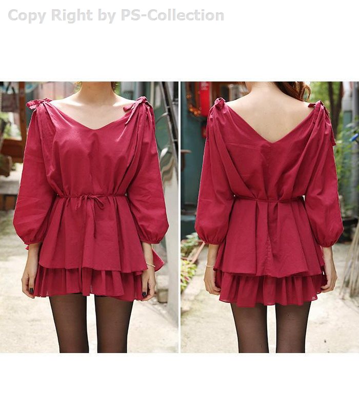 เสื้อตัวยาวหรือเดรสสั้นสไตล์เกาหลี คอป้าน หัวไหล่ผูกโบว์ ชายซ้อน ผ้า cotton แบบน่ารักมากๆ