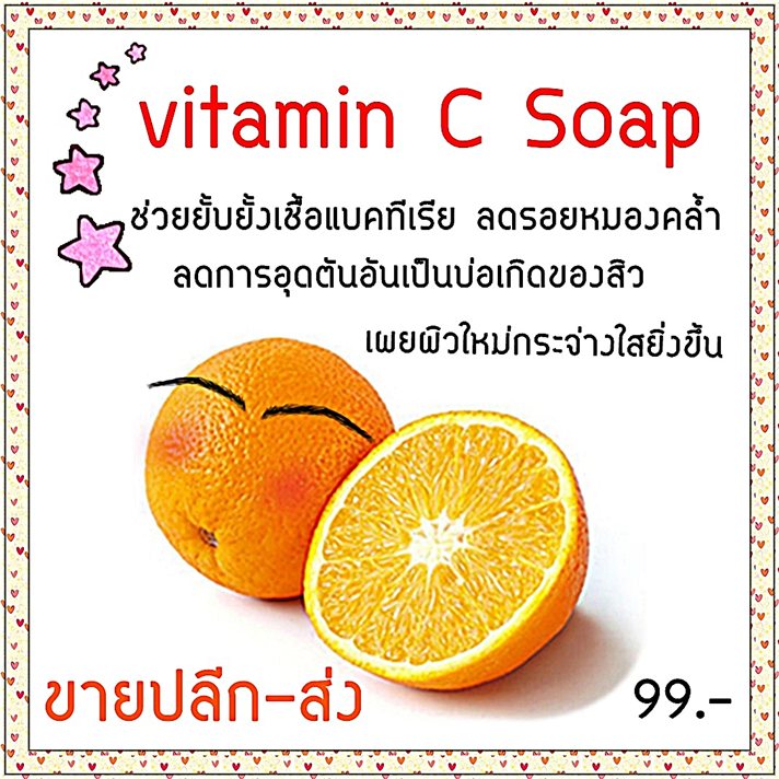 สบู่ส้มหน้าใสสำหรับสาวทุกสภาพผิวและสาวๆที่ผิวหน้าหมองคล้ำ สบู่ส้มหน้าใสพร้อมคืนความชุ่มชื้นให้แก่ผิวด้วยวิตามินซี+วิตามินบี3 วิตามินซี มีอยู่แล้วในผิวหนังของเรา แต่ปริมาณจะลดลงตามวัยที่เพิ่มขึ้น ในช่วงอายุ 15-50 ปี วิตามินซีในผิวจะลดระดับลงถึง 50% ที่สำคัญร่างกายไม่สามารถสังเคราะห์วิตามินซีได้เอง ต้องนำเข้าสู่ร่างกายโดยการรับประทานหรือทาบนผิวหนังโดยตรง อย่างไรก็ตามการทานวิตามินซีกลับให้ผลต่อผิวหนังน้อยกว่าการทาผลิตภัณฑ์ที่ มีวิตามินซีสรรพคุณ Vitamin C • กระตุ้นการสร้างเส้นใยคอลลาเจน และต่อต้านอนุมูลอิสระจึงทำให้ผิวกระชับและชลอริ้วรอย • ยับยั้งการสร้างเมลานินทำให้ผิวขาวขึ้น ลดการเกิดฝ้า กระ • ปกป้องเซลล์ผิวไม่ให้ถูกทำลายจากรังสี UVA เป็นการชลอริ้วรอยจากแสงแดด และยังป้องกันกา...รเกิดมะเร็งผิวหนัง • รักษาสิว โดยไปยับยั้งเชื้อแบคทีเรียที่ทำให้เกิดสิว ซึ่งมีประสิทธิภาพดีกว่าตัวยา Benzoyl peroxide Vitamin B3 . กรดอะมิโนและนิวคลีอิค เอซิด ช่วยลดการผลิตเม็ดสีผิวหมองคล้ำ จึงทำให้ผิวขาวใสขึ้นตามธรรมชาติ