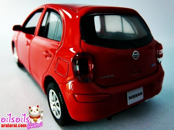โมเดลรถนิสสัน มาร์ช (Nissan March) สีแดง ทำจากเหล็กและพลาสติก ขนาดกว้างประมาณ 5.3 ซ.ม. ยาวประมาณ 11.5 ซ.ม. สูงประมาณ 4.8 ซ.ม. สามารถเปิดประตูด้านหน้าได้ แล่นได้โดยการดึงรถถอยหลังแล้วปล่อย