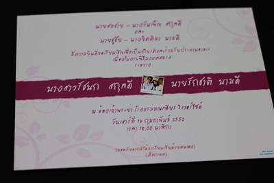 การ์ด Photo WD-A036 การ์ด Photo กระดาษที่ใช้เป็นกระดาษคุณภาพจากต่างประเทศ 260 แกรม กันน้ำ พิมพ์ด้วยระบบ Digital ไม่ซีดจางเหมือนกระดาษอัดรูปแถมฟรี!!!!!! blessing card (การ์ดอวยพรบ่าวสาว) ลายเดียวกับการ์ดแต่งงาน เมื่อสั่งพิมพ์การ์ดขนาด 5*7 นิ้ว