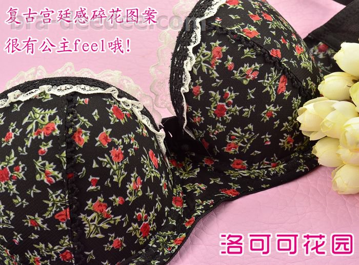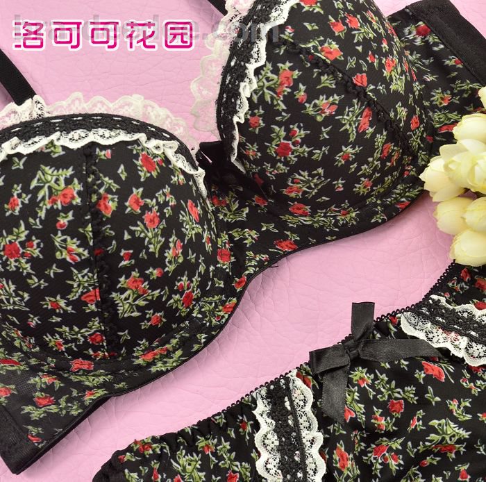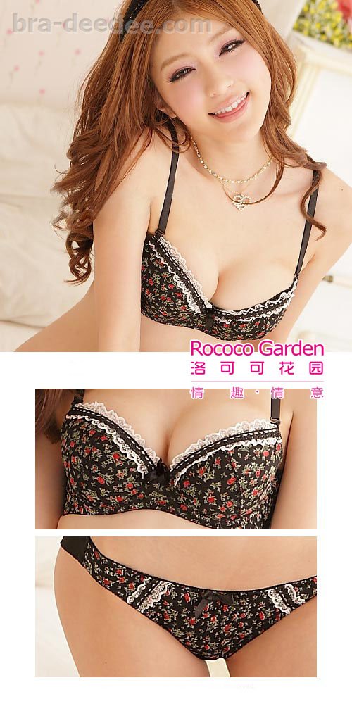 ชุดชั้นในพร้อมบิกินี่เข้าชุดสีดำลายดอกไม้ ประดับด้วยขอบลูกไม้สีขาว สายบราสีดำ ออกแนวหวานปนเซ็กซี่นิดๆ