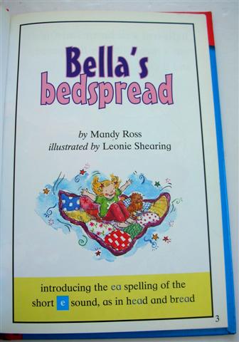 หนังสือใหม่ปกแข็ง จำนวน 28 หน้า เรื่องสั้นประกอบด้วยคำศัพท์ง่ายที่มีเสียงสระ หรือพยัญชนะที่เหมาะกัน เพื่อให้เด็กรู้จักการเชื่อมโยงพยัญชนะกับการออกเสียง การเล่านิทานที่ฝึกการออกเสียง เพียงวันละ 10 นาทีทุกวัน จะช่วยให้เด็กๆ ออกเสียงคำศัพท์ได้ดีขึ้นและสนุกกับการอ่านมากขึ้น เรื่องสั้นภายในเล่มดังนี้ - Bella's bedspread