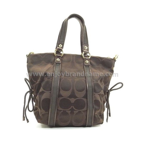 - Coach Signature Sateen Brown Fabric with Brown Leather Trim