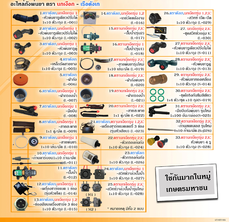 ถังพ่นยาไฟฟ้า(แบตเตอร์รี่)นกเงือก ใช้ฉีดพ่นยา พ่นสารเคมีได้อย่างทั่วถึง และช่วยทุ่นแรง โดยหัวฉีดที่เป็นตัวบังคับการไหลและกระจายตัวของละอองยาให้สม่ำเสมอ หัวฉีดจะมีหลายหัวไว้สำรองเปลี่ยน เพื่อให้เหมาะสมกับการใช้งานฉีดพ่นยาในแต่ละแบบ สามารถใช้พ่น ยาฆ่าหญ้า ปุ๋ยน้ำ สารกำกัดแมลง และอื่นๆ