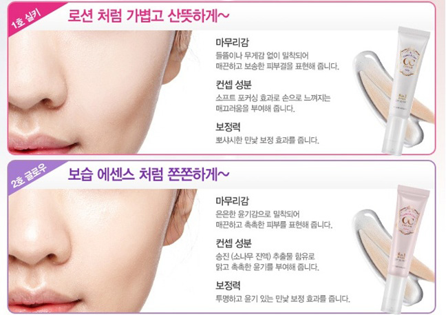 Etude CC (Correct&Care) Cream SPF30/PA++ CC Cream คือการรวมของเมคอัพและสกินแคร์ 8 in 1 ในหลอดเดียวประกอบด้วย 1. Anti-Wrinkle Essence 2. Stress Care Essence 3. Whitening Essence 4. Moisture Cream 5. UV Block 6. Makeup Base 7. Primer 8. Aura Volumer มี 2 เบอร์ให้เลือกค่ะ No.1 Silky เนื้อปกปิด บางเบา No.2 Glow เนื้อโกลว์ เงาวิ๊ง
