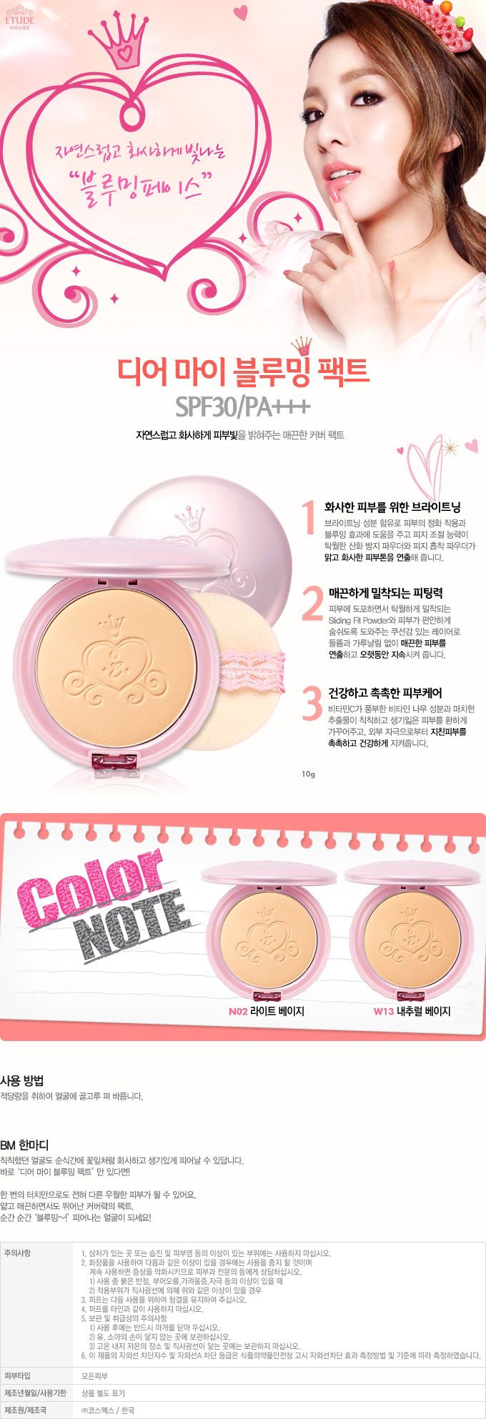 Dear My Blooming Pact แป้งพัฟไม่ผสมรองพื้น เนื้อบางเบา ช่วยควบคุมความมัน พร้อมปกปิดริ้วรอย ให้ผิวหน้าเรียบเนียน ช่วยปกป้องผิวจากแสงแดดได้ทั้ง UVA,UVB ถึง30เท่า ส่วนผสมของวิตามินซี ช่วยต่อต้านอนุมูลอิสระและทำให้ผิวรู้สึกสดชื่น มีให้เลือก 2 สี #N02 Blooming Light Beige สำหรับผิวขาว #W13 Blooming Natural Beige สำหรับผิวขาวเหลือง-ผิวสองสี ปริมาณ 10g