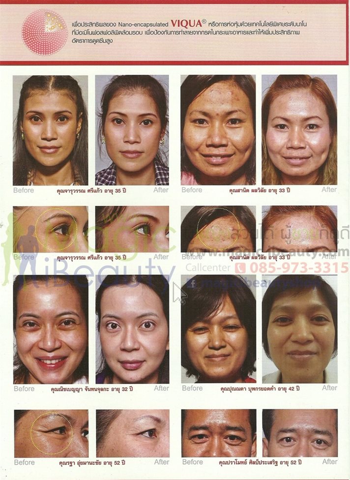 ริ้วรอยตีนกา ดีขึ้น ร่องแก้มที่กดลึกและหย่อนคล้อย เต็มตื้นขึ้นรอยแผลเป็นบนใบหน้า ตื้นขึ้น รอยแผลเป็นจางลง ปัญหาถุงน้ำใต้ตาที่หย่อนคล้อย จะหมดไปภายใน 2 สัปดาห์เท่านั้น
