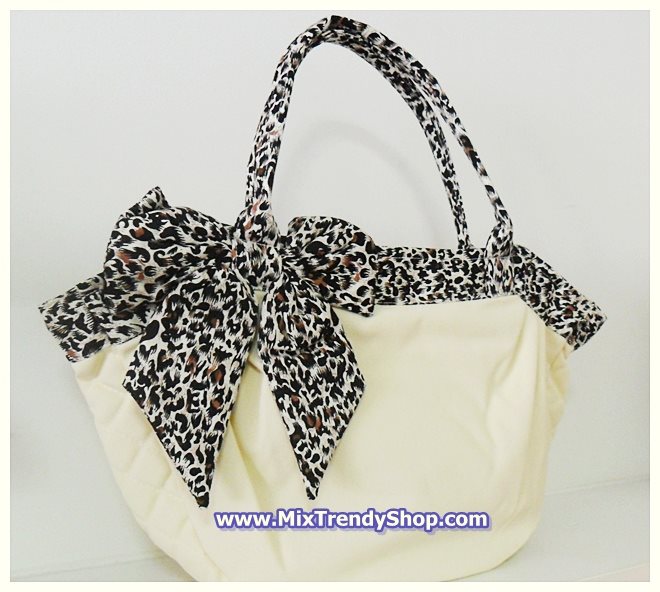 กระเป๋าผ้านารายา (NaRaYa) กระเป๋าสะพายผ้านาโนสีครีม ทรงตะกร้าแต่งโบว์ลายเสือ (ตามรูปแรก)