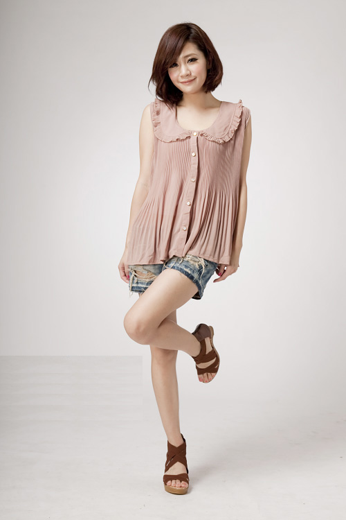 เสื้อแขนกุดผ้าชีฟอง กระดุมหน้า อัดพลีทด้านหน้า-สีชมพู