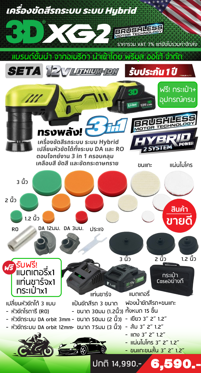 เครื่องขัดสีรถยนต์ไร้สาย 3D USA รุ่น XG2 12V ระบบ Hybrid เปลี่ยนหัวขัดได้ 2 ระบบ