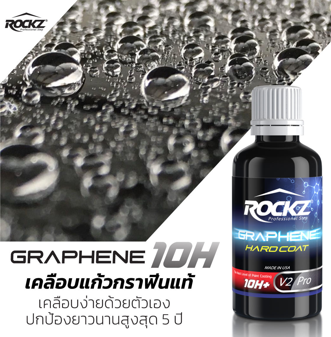น้ำยาเคลือบแก้วกราฟีน 10H จาก ROCKZ ใช้งานง่าย เคลือบง่าย แต่ให้ผลงานน่าประทับใจ ปกป้องสีรถได้อย่างดีเยี่ยม ป้องกันการเกาะตัวของหยดน้ำได้อย่างดีเยี่ยม รวมถึงติดทนนานสูงสุดถึง 5 ปี สำหรับรุ่น V2 Pro
