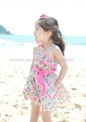 เดรสสายเดี่ยว สีชมพูลายดอกไม้หวาน กระโปรงบาน **งาน B2W2**