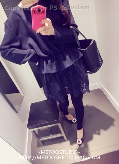 เดรสแฟชั่นสไตล์เกาหลี แขนยาว ตัดต่อกระโปรงผ้าลูกไม้ แบบน่ารักมากๆ ค่ะ