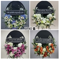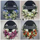 พวงหรีดพัดลมตั้งโต๊ะ 16 นิ้ว ประดับด้วยดอกไม้ประดิษฐ์สีฟ้ามุมขวาล่าง