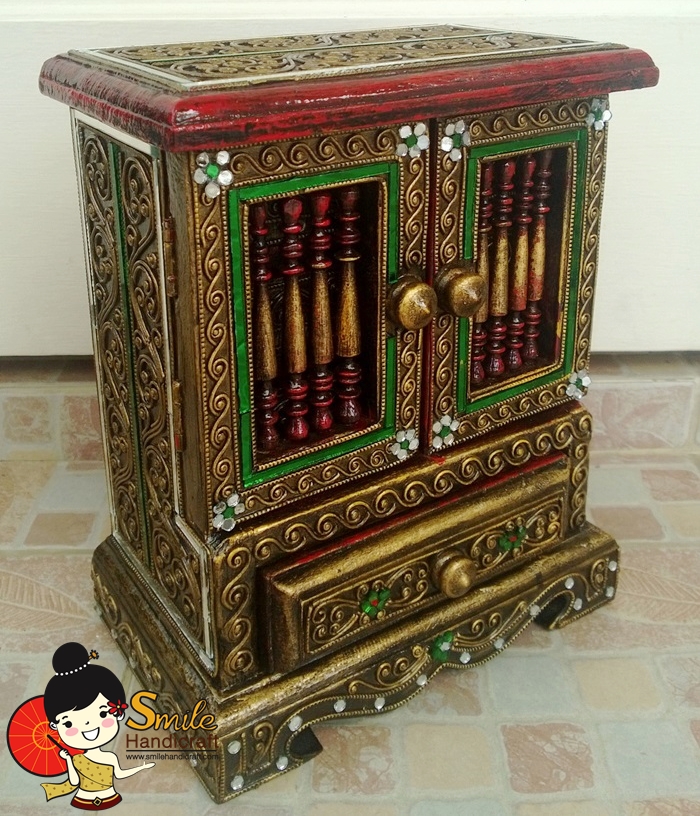 ตู้ลิ้นชักบานซี่ (ขนาดเล็ก) งานแต่งลายเส้นและประดับกระจก ทำสีทองแบบงานเก่า บานเปิดปิดติดแม่เหล็กสำหรับยึดบานประตู เมื่อเปิดออกด้านในจะมีลิ้นชัก 3 ชั้น และด้านล่างอีก 1 ชั้น เหมาะสำหรับเก็บพระเครื่อง เครื่องประดับ ใช้ตกแต่งบ้าน หรือมอบเป็นของขวัญ