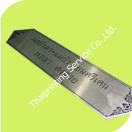 ป้ายอลูมิเนียม กัดกรดเป็นตัวอักษร และลายไทย ลงสีดำ ใช้เป็นป้ายชื่อผู้บริจากต่าง