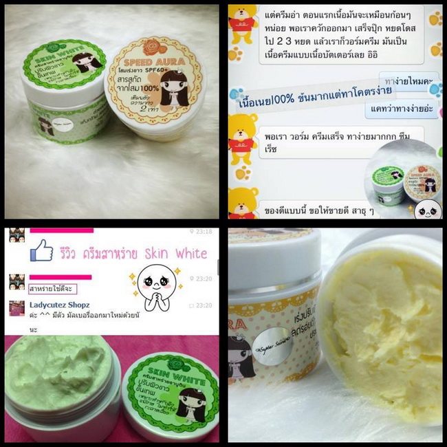 speed aura โสมเร่งขาว SPF60+ สารสกัดจากโสม 100 เปอร์เซ็น เติมพลังความขาว 2 เท่า เร่งปรับผิวขาวภายใน 1-2 สัปดาห์ ลดรอยดำ สีผิวไม่สม่ำเสมอ ให้ผิวกายขาวใส เปล่งประกาย พร้อมปกป้องผิวจากแสงแดด SPF60+ สารสกัดจากโสมแท้ 100 เปอร์เซ็น เพิ่มโดสเติมความขาว x2 ถ้าพิสูตรขาวออร่า ใน 7 วัน เนื้อครีมเข้มข้น คว่ำไม่หก กลิ่นหอมซากุระ ด้วยสารสกัดจากโสมแท้ และอาบูติน เพิมความขาว 2 เท่า ผลลัพท์ที่ได้ ปกป้องผิวจากแสงแดดและมลภาวะ ที่ก่อให้เกิดผิวดำ คล้ำ เสีย ด้วยกันแดด SPF60 เร่งผลัดเซลล์ผิวช่วยให้ผิวกายขาวแบบมีออร่า ภายใน 1-2 สัปดาห์ ทาบำรุงเช้าเย็น อย่างต่อเนื่อง ลดรอยดำ สีผิวไม่สม่ำเสมอ ให้ขาวเด้ง เปล่งประกายแบบมีออร่า