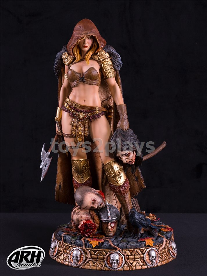 ARHIAN statue features a removable magnetic top, removable second belt, interchangeable heads, so you can choose to display her with cape and hood or simple without it, and you can also remove the heads from the base, including the one she is holding, or nude without her top and second weapon’s belt, so you can have a much cleaner and less gory display if this is your preference.