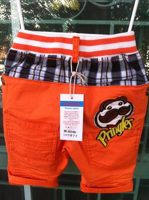 กางเกง4-5ส่วนสีส้มฟริงเกิลผ้าผสมยีนส์ยืด ป้ายเกาหลี 2-9ขวบ(พร้อมส่ง)